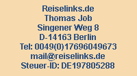 | Thomas Job Singener Weg 8 14163 Berlin Deutschland Telefon: +49(0)17696049673 (es können ggfls. Kosten für eine Verbindung in das Mobilfunknetz entstehen) E-Mail: mail ((at)) reiselinks.de - ((at)) = @-Zeichen |